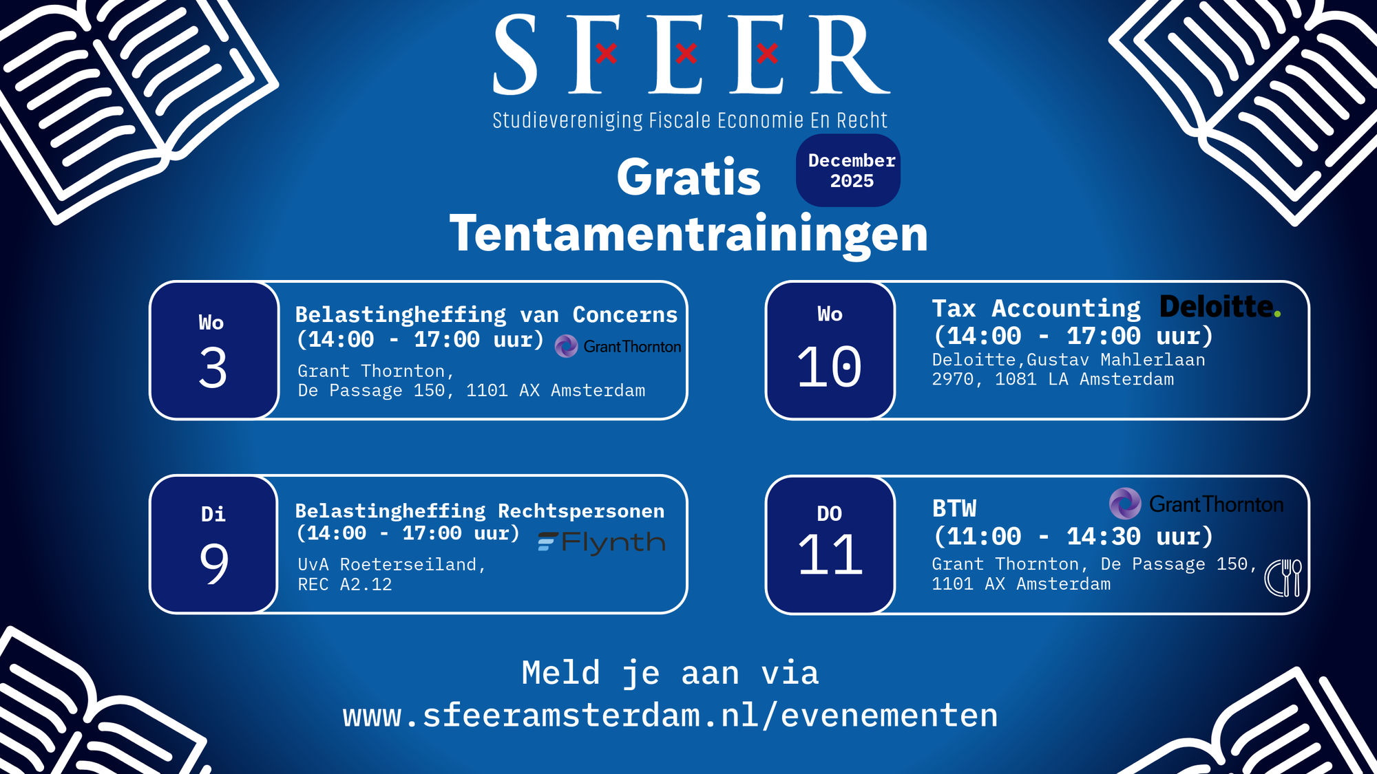 Op donderdag 11 december van 11:00 tot 14:30 uur organiseert SFEER in samenwerking met Grant Thornton speciaal voor jullie een tentamentraining op het kantoor van Grant Thornton.
